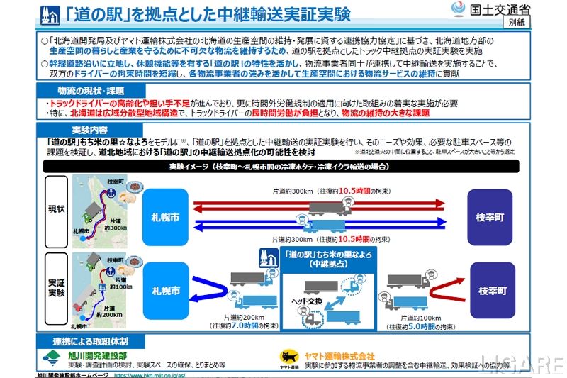 同実証実験は、道北地域において物流事業者が連携し、幹線道路沿いに立地し休憩機能等を有する道の駅の特性を生かしたものだ。「労働環境の改善」、「輸送費用の低減」、「環境への負荷の軽減」の3つの効果を検証し、生産空間における物流サービスの維持への貢献を確認している。