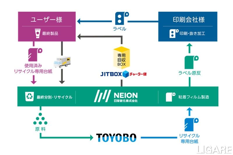 また、同プロジェクトでは、ユーザーが使用済みのラベル台紙(リサイクル専用台紙)を、資源(有価物)として、通常20円/kgで有価回収する。ラベルユーザーは、これまで台紙(剥離紙)の廃棄に費用をかけていたところ、逆に、資源(有価物)として日榮新化に販売できる予定だ。