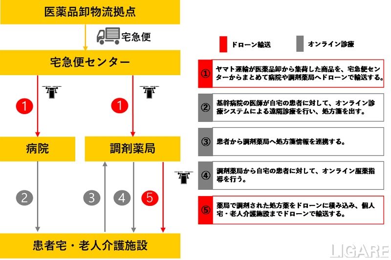 具体的には、対象エリアに配達を行う医療用医薬品等の商品を、医薬品卸ティーエスアルフレッサ株式会社の物流拠点からヤマト運輸が集荷する。宅急便センターから医療機関までの納品、およびオンライン診療・服薬指導後の処方薬の患者宅までへの配送は、ガイドラインに準拠した業務手順書をもとに行う。