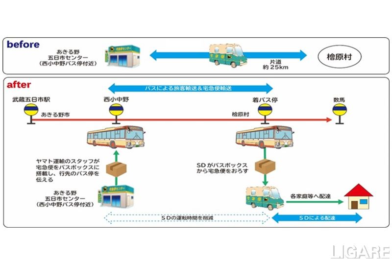 西東京バスが運行する、武蔵五日市駅バス停~数馬バス停間の路線バスは、あきる野市と檜原村を結ぶ唯一の公共交通機関として地域住民の重要な交通手段だが、人口減などの要因で路線維持が課題となっている。一方、ヤマト運輸は、あきる野五日市センターに午後到着する宅急便を檜原村の利用客に届けるため、あきる野五日市センターと檜原村を、片道約40分かけて往復しており、サービス提供時間の確保と集配効率化に課題を抱えていた。