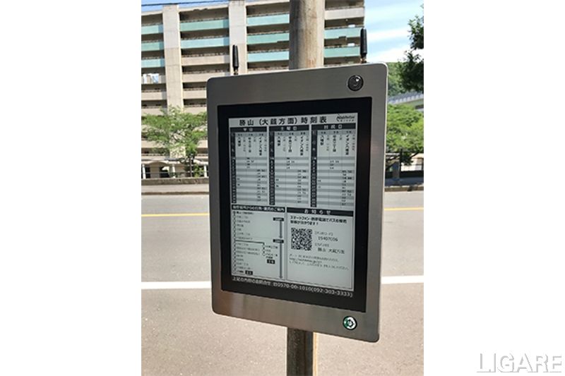 「スマートバス停」は、デジタルサイネージにバスの運行時刻表や運行系統図に加えて、その他の告知文や広告などを遠隔から更新、表示できるバス停だ。動画などの豊富な情報配信が可能なモデルや、乾電池駆動によりさまざまな気象条件下でも電源供給なしで稼働できる省電力型の「楽々モデル」など、さまざまなタイプを開発・販売している。