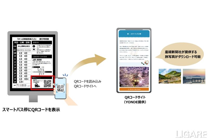 また、同実証実験では、QRコードを活用した広告等収益につながるコンテンツを提供するビジネスモデルの検証を行う。具体的には、スマートバス停に、産経新聞社の「探訪シリーズ」で過去に人気を集めた旅の写真をダウンロードできるQRコードを表示する。そのダウンロードによって得られたデータから、QRコードの認知効果を分析する。