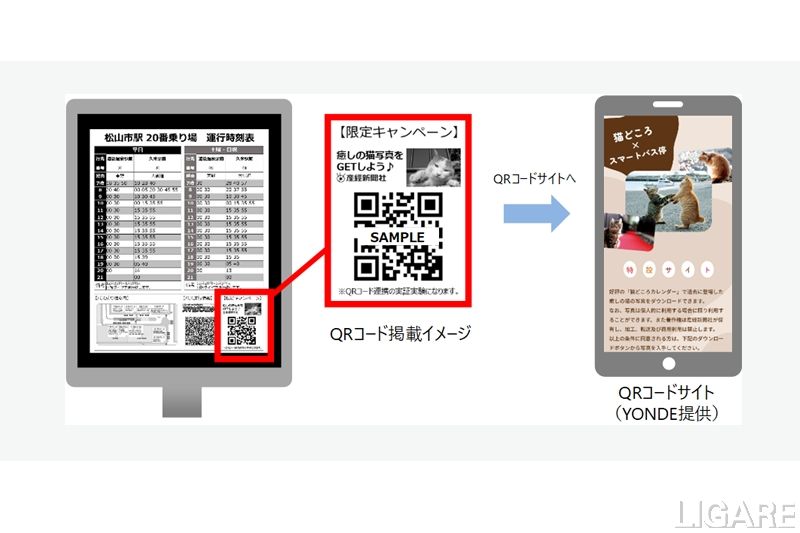 今回の実証実験では、コロナ禍によりダイヤ改正などの業務量が増加しているバス事業者によるバス停管理業務の負担軽減効果とユーザーの利便性向上の検証を行う。さらに、両社は、株式会社産業経済新聞社(以下、産経新聞社)と株式会社YONDE(以下、YONDE)とも連携し、新たなビジネスモデル構築の検証も行う。具体的には、YONDEがQRコードサイトを提供し、このQRコードにより、産経新聞社が提供する「猫どころカレンダー2021」の猫写真コンテンツをダウンロードできる。ダウンロードによって得られたデータからQRコードを用いた認知効果を分析する。