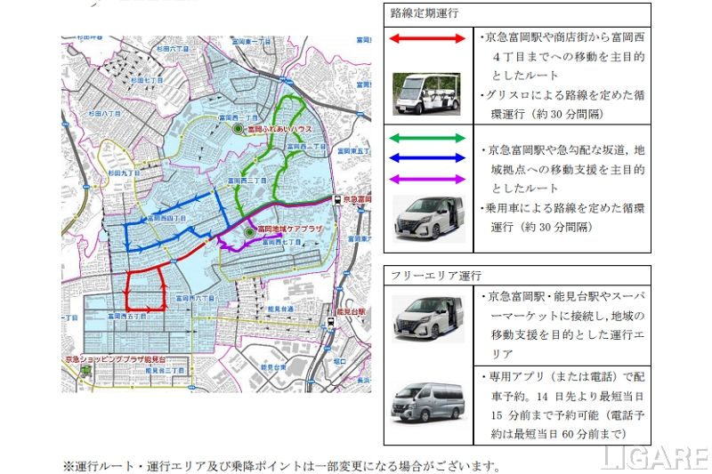 京浜急行電鉄、横浜国立大学、横浜市、日産自動車は、横浜市金沢区富岡エリアにおいて「乗合型移送サービスの実証実験」を11日から開始することを発表した。