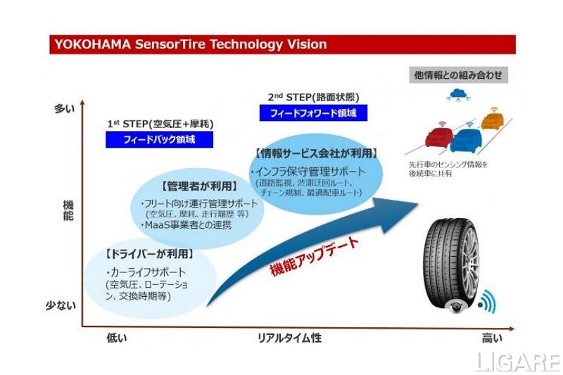 SensorTireは、センシング機能とリアルタイム性を指標として、それぞれに適したセンシング機能やデータ分析・予測技術を段階的に構築し、センシング機能の利活用範囲の拡大を行う。まずは個人向けや車両運行管理会社を対象とした空気圧通知サービスの実証実験から開始し、2023年までに摩耗検知機能を追加する。これにより、タイヤローテーション時期の通知や、複数の車両を所有する企業や官公庁など向けに効率的なタイヤ点検計画などの提案が可能になる。