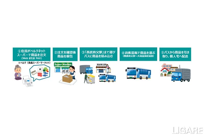 今回の実証では、2022年度の実証の残課題であった「荷物引継ぎ時のオペレーション」を実装を見据えて調整し、地域課題の解決と事業者の輸送の効率化を目指す。具体的な流れとしては、利用者が、WebまたはFAXでスーパーマーケットに商品を注文。ヤマト運輸株式会社が、定時定路線で運行している既存の路線バスに注文商品を積み込む。その後、西武観光バス株式会社が、貨客混載で西武秩父駅~大滝温泉遊湯館まで商品を運ぶ。