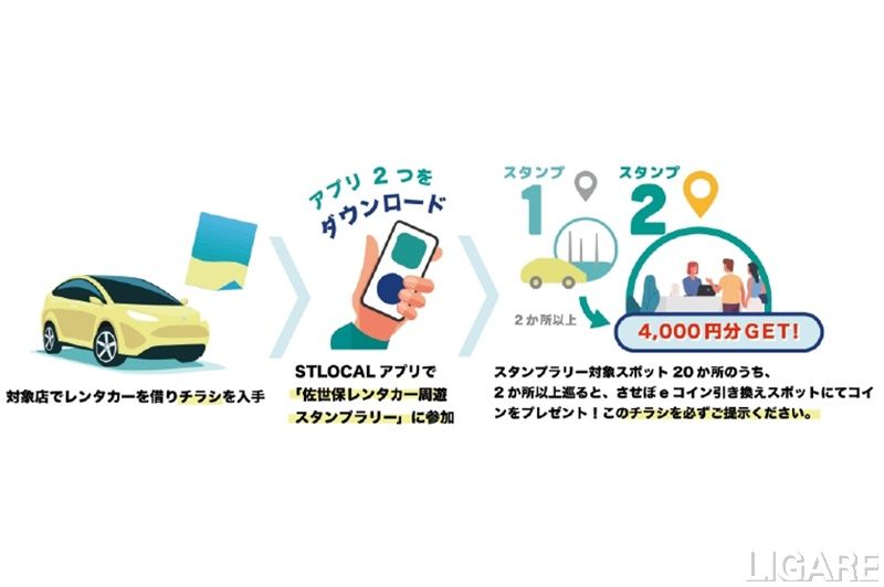 具体的な内容としては、九州エリアにあるオリックスレンタカーとニッポンレンタカーの対象店舗で車を借りて、キャンペーンの参加証であるチラシを入手。佐世保市内にあるチェックイン対象の観光スポット20カ所の内、2カ所以上「STLOCAL」でデジタルチェックインすると、「させぼeコイン※」が指定の引き換えスポットで取得できる。また、プレゼントチェックインスポットでは、土産ももらえるという。