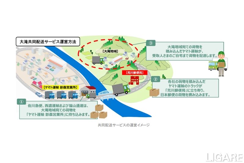 具体的には、佐川急便、西濃運輸、および福山通運が、大滝地域宛ての荷物をヤマト運輸 影森営業所に持ち込む。その後、ヤマト運輸のトラックが荒川郵便局に立ち寄り、日本郵便の荷物を積み込み、受取人の自宅まで荷物を配達するという流れだ。位置情報ビッグデータによる配送効率性の分析は、ゼンリンが担当する。