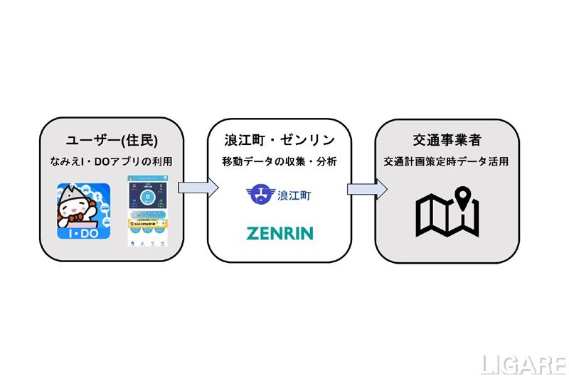 今回の実証では、2022年度同様「なみえ I・DO アプリ」を通して住民(ユーザー)の移動データを収集する。ほかにも、バスやタクシーといった公共交通機関の移動データも収集し、浪江町の“移動”の傾向を幅広く分析する。さらに、移動データの収集・利活用を行うことで地域の交通サービスの最適化に寄与する新たなビジネスモデルを構築していくという。
