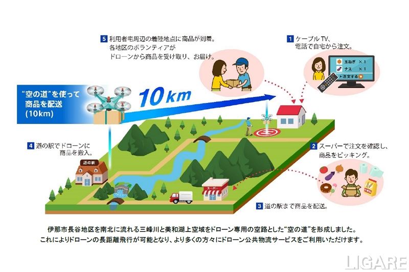 また、両者は、2020年8月より自治体運営によるドローン配送を行っている。このサービスでは、利用者がケーブルテレビの画面や電話で商品を注文する。その後、サービス担当者がスーパーへ赴いて商品を引き取り、利用者宅にドローンで届けるという流れだ。