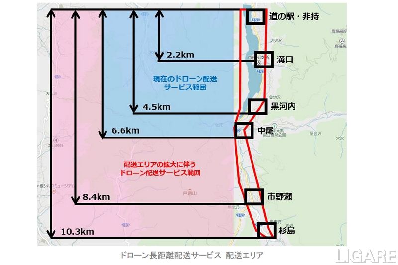 さらに、10km以上の長距離飛行の実現により、新たに市野瀬、杉島の2つの地区でも、ドローン配送サービスが利用可能となった。両者が開発した「衝突判定アプリ」により、障害物を考慮した安全な飛行ルートを設定できる。これにより、事前に障害物情報を察知し、現場での操作ミスを防ぐことが可能だ。
