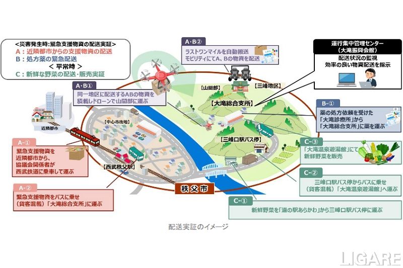 同協議会では、物流・公共交通ネットワーク「秩父モデル」構築への取り組みを、2020年11月より開始している。今回の実証実験では、ヒトとモノの移動改善や最適化、効率化を図り、持続性の高いモデル構築を目指す。複数のモビリティを融合した配送の実証は日本初だ。