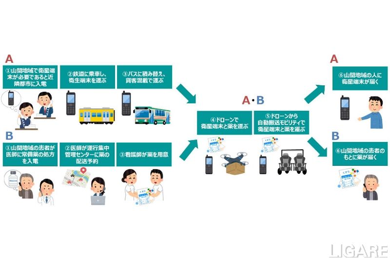 しかし、山間地域の多さと住民の高齢化により、災害発生時や日常生活において生活交通・物流等の生活インフラの維持が困難になっている。また、買い物ができる場所までの距離が遠く、外出の機会が減るという課題も抱えている。同協議会は、このような課題解決のために、ドローン、鉄道、路線バス、自動搬送モビリティなど複数のモビリティを実際に連携して配送から販売などを一連で実証した。