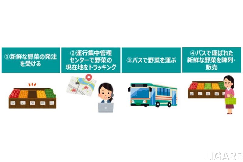 平常時の新鮮な野菜の配送・販売実証は、11月5日、12日、19日、26日に実施した。この実証実験の目標は、買い物弱者を支援する物資配送の仕組みの構築だ。地域によっては、市街地などに売られている新鮮な野菜を購入できない場所もある。このような地域の住民が地元で購入できるように、貨客混載による配送の有用性を検証する。