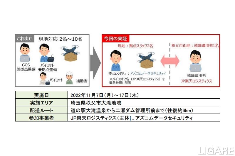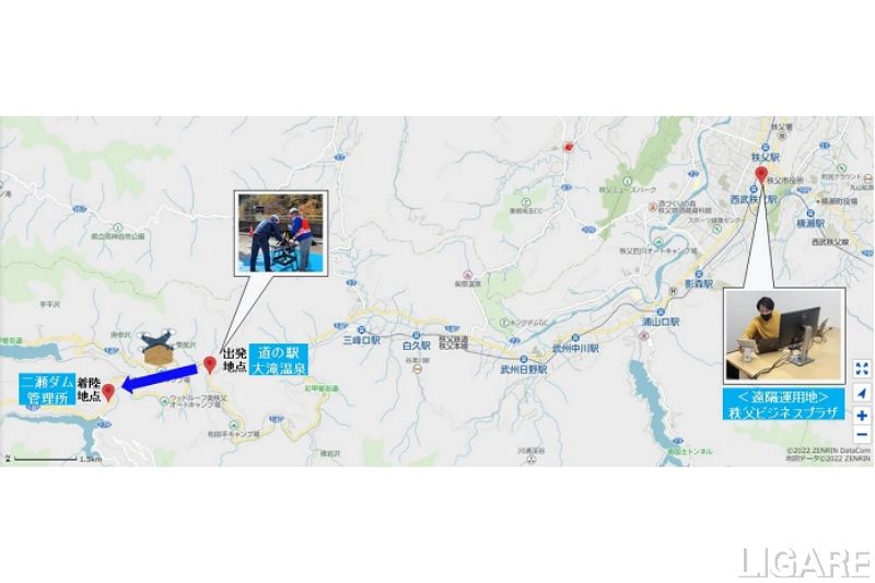 また、同実証は、秩父市の大滝地域で実施した。ドローン配送では、遠隔運用の体制のもと、最大積載量7kgのドローン機体を活用した。そして、弁当や飲料などの物資を道の駅大滝温泉から二瀬ダム管理所前まで、山間地域を含む往復約6kmの距離で配送している。同実証により、今後どこからでもドローンの遠隔運用の体制を構築できることを確認している。