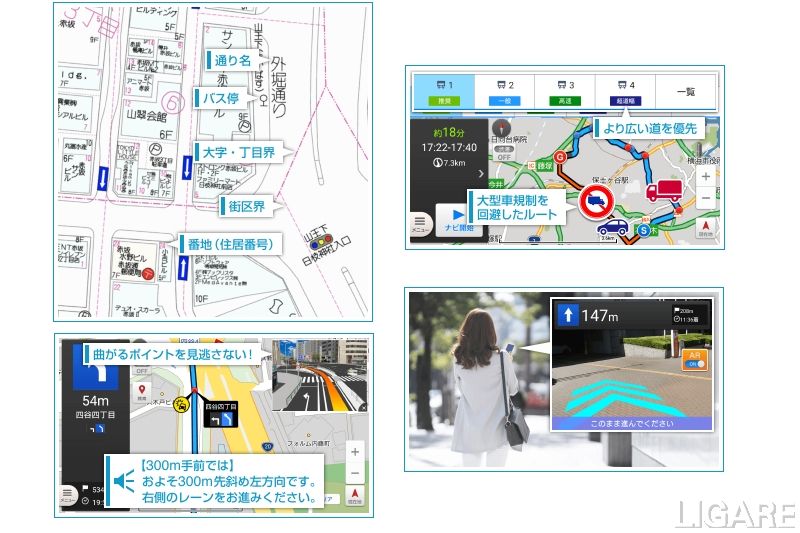 ほかにも、 同サービスでは、設定した車種に応じた規制を回避したルートを検索することができる。中型車以上は、道幅を極力優先する「超道幅」ルートも搭載している。くわえて、徒歩ナビで利用できるARモードでは、進む方向を実際の景色でサポートし、目的地周辺ではゼンリン住宅地図でサポートする。