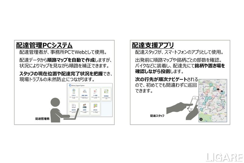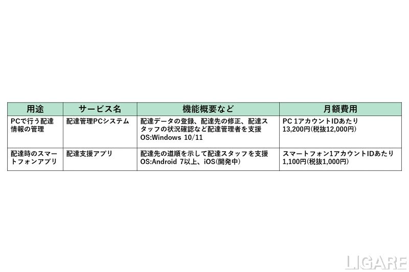 また、同サービスは、Webの配達管理PCシステムとスマートフォンの配達支援アプリで構成されている。配達管理PCシステム用のIDを1つと、配達支援アプリ用のIDを3つという組み合わせを基本とし、状況に合わせて配達支援アプリを追加で利用できる。