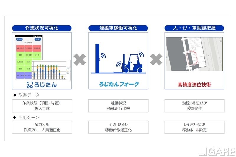 さらに、両社は、フォークリフト・リーチフォーク・運搬車といったクルマの稼働状況・積載走行比率を把握することを組み合わせた総合的な情報可視化サービスの展開を推進するという。