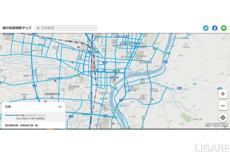 「通行実績情報マップ」は、本田技研工業株式会社の提供する道路通行実績情報を活用した災害時のための地図だ。今回公開するサービスは、カープローブデータを用いて、災害時に車両の通行実績があり、車両が通行できると推定される道路の情報を提供する。目的は、福島県沖地震の被災地域における移動支援だ。